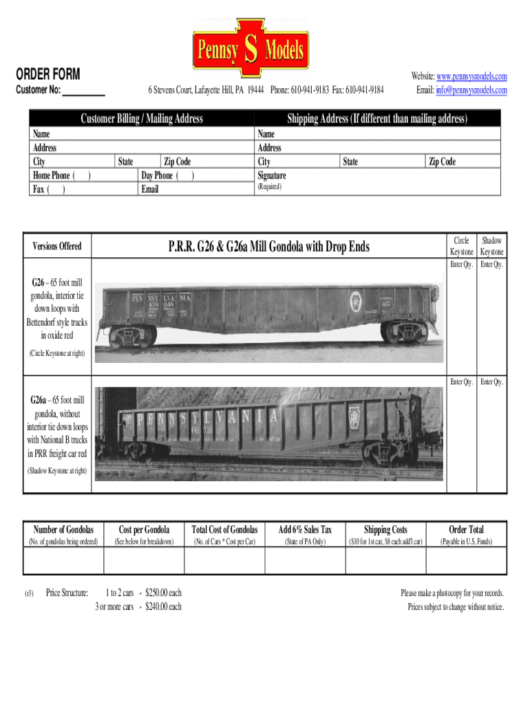 ORDER FORM Customer No:Website: www.pennsysmodels.com Email: info pennsysmodels.com6 Stevens Court, Lafayette Hill, PA 19444 Phone: 6109419183 Fax: 6109419184Customer Billing / Mailing Address Name