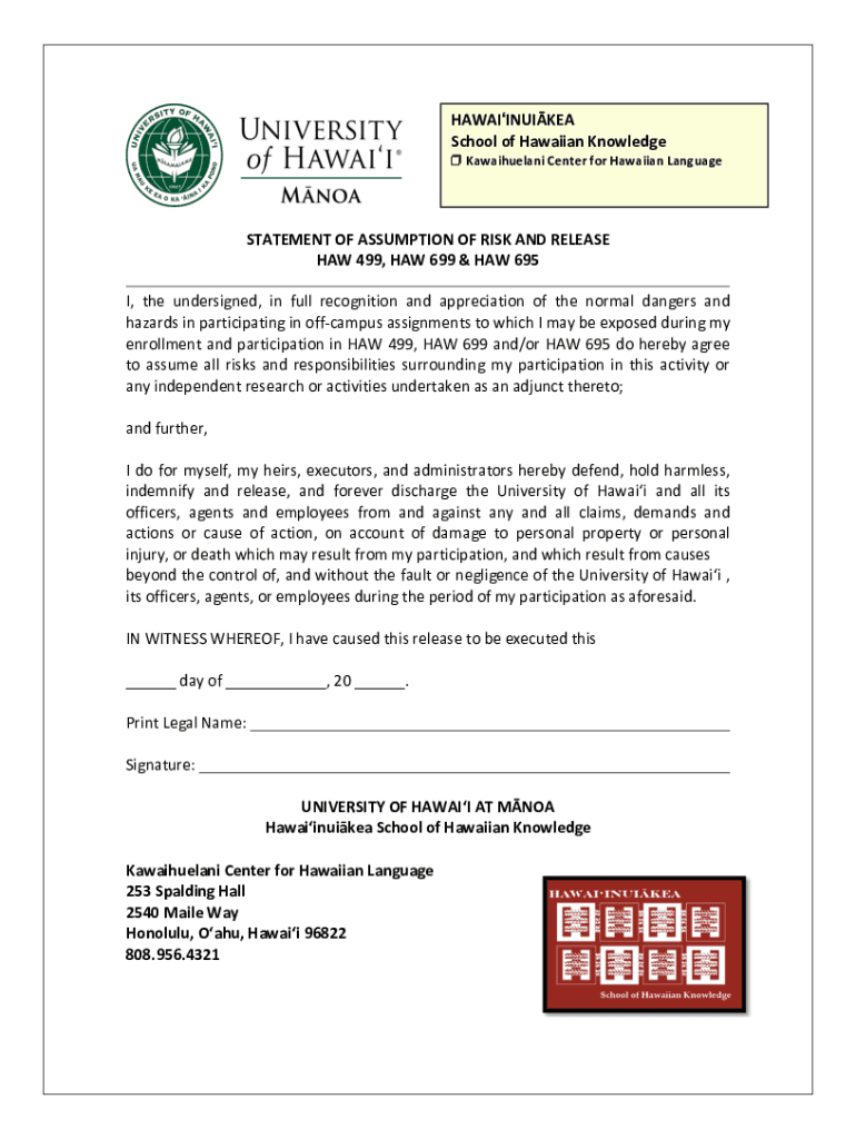 HAWAIINUIKEA SchoolofHawaiianKnowledgeKawaihuelaniCenterforHawaiianLanguageSTATEMENTOFASSUMPTIONOFRISKANDRELEASE HAW499,HAW699&HAW695I, the undersigned, in full recognition and appreciation of the