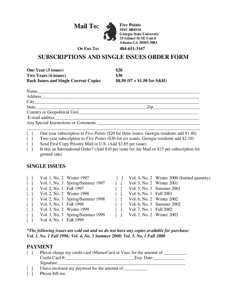 Mail To:Five Points MSC 8R0318 Georgia State University 33 Gilmer St SE Unit 8 Atlanta GA 303033083Or Fax To:4046513167SUBSCRIPTIONS AND SINGLE ISSUES ORDER FORM One Year (3 issues) Two Years (6 issues)