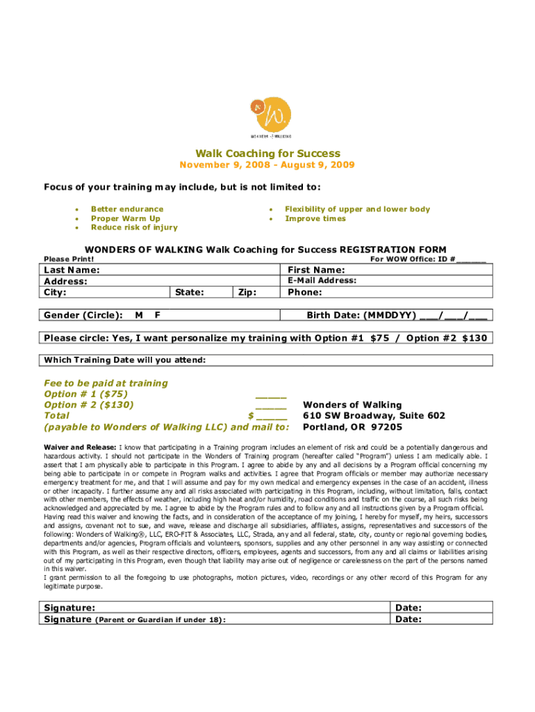 WalkCoachingforSuccess November9,2008August9,2009 Focusofyourtrainingmayinclude, butisnotlimitedto: Better endurance ProperWarmUp Reduceriskofinjury Flexibilityofupperandlowerbody ImprovetimesWONDERSOFWALKINGWalkCoachingforSuccessREGISTRATIONFORM