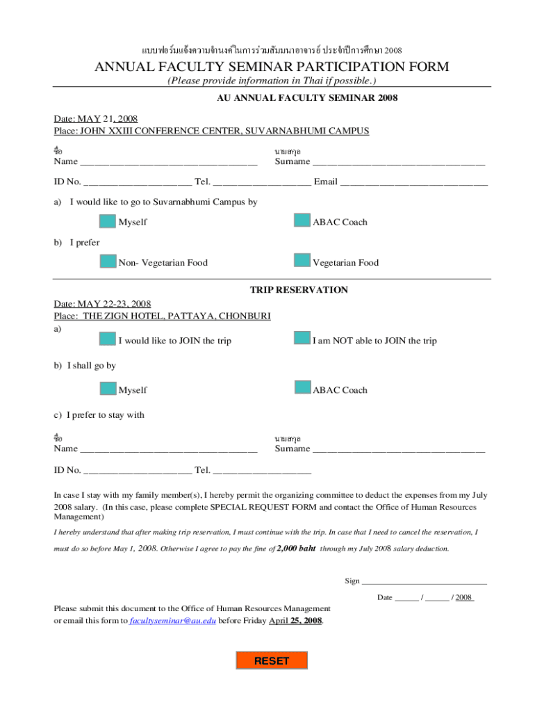 2008ANNUAL FACULTY SEMINAR PARTICIPATION FORM (Please provide information in Thai if possible.) AU ANNUAL FACULTY SEMINAR 2008 Date: MAY 21, 2008, Place: JOHN XXIII CONFERENCE CENTER, SUVARNABHUMI