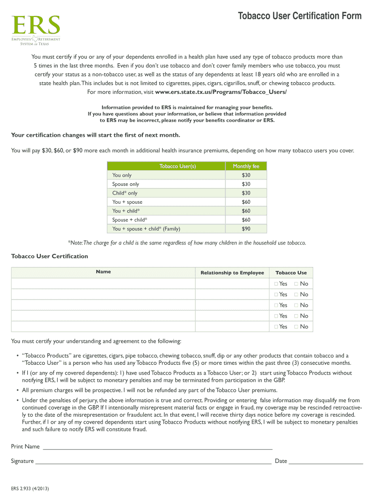 Tobacco User Certification Form You must certify if you or any of your dependents enrolled in a health plan have used any type of tobacco products more than 5 times in the last three months. Even