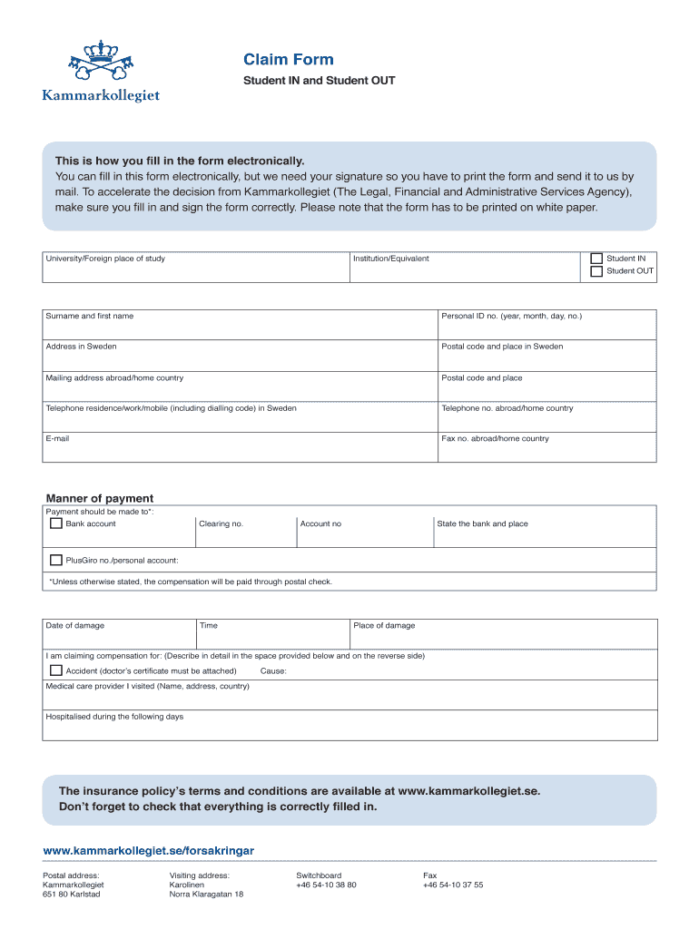 The Student Insurance Claim Form is specifically for students enrolled at universities in Sweden who need to claim compensation for damages, accidents, or other covered events.