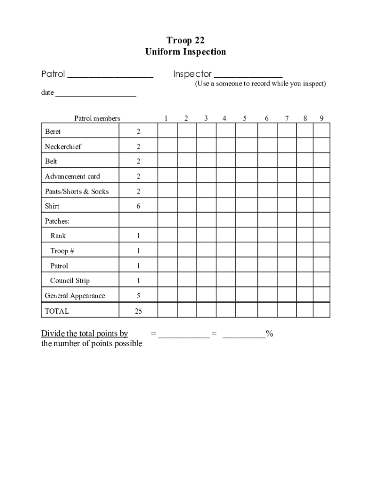 Troop 22 Uniform Inspection Patrol Inspector (Use a to record while you inspect)date Patrol members1Beret2Neckerchief2Belt2Advancement card2Pants/Shorts & Socks2Shirt623456Patches: Rank1Troop #1Patrol1Council