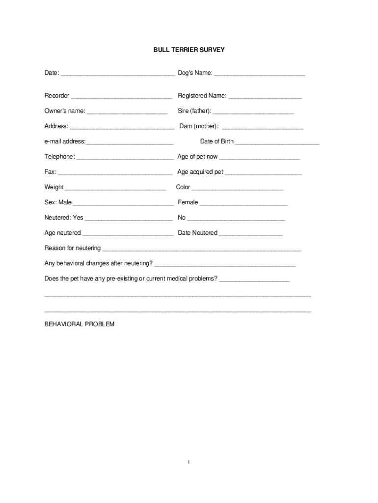 BULL TERRIER Surveyable: Dog's Name: Recorder Registered Name: Owner's name: Sire (father): Address: Dam (mother): email address: Date of Birth Telephone: Age of pet now Fax: Age acquired pet Weight