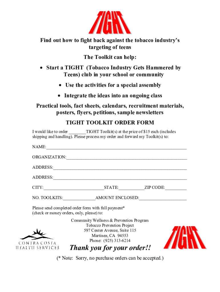 Find out how to fight back against the tobacco industries targeting of teens The Toolkit can help: Start a TIGHT (Tobacco Industry Gets Hammered by Teens) club in your school or community Use the