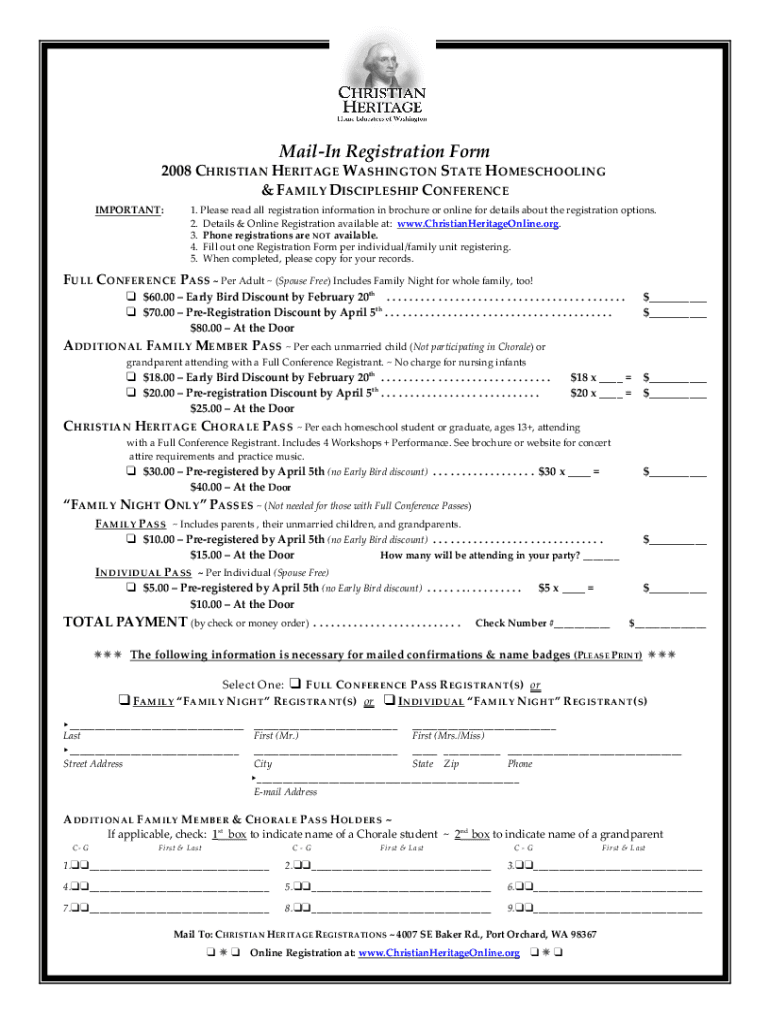 Mailing Registration Form 2008 CHRISTIAN HERITAGE WASHINGTON STATE HOMESCHOOLING & FAMILY DISCIPLESHIP CONFERENCE IMPORTANT:1. Please read all registration information in brochure or online for details