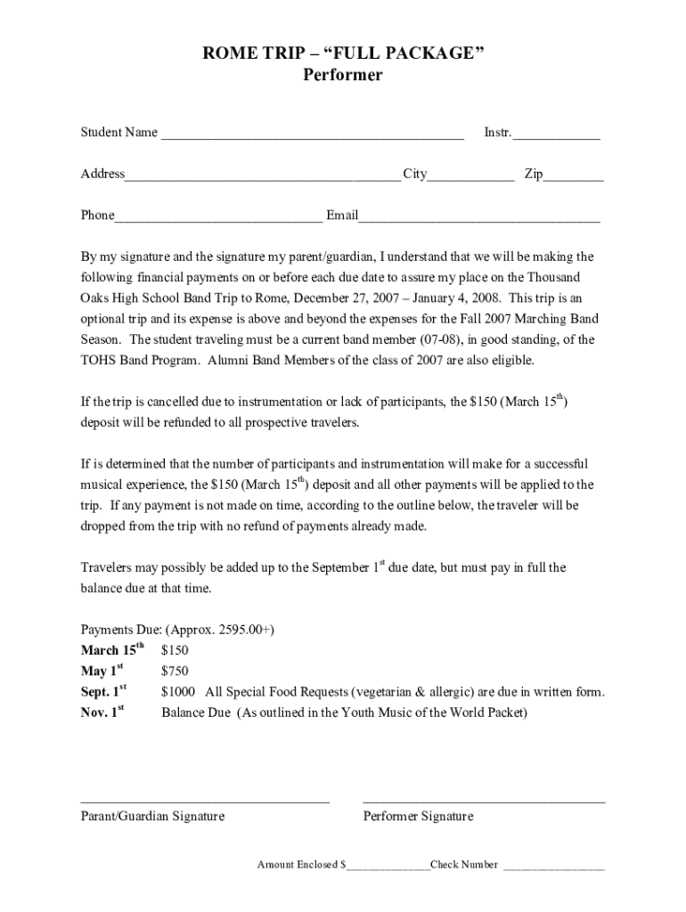 ROME TRIP FULL PACKAGE Performer Student Name Instr. Address City Zip Phone Email By my signature and the signature my parent/guardian, I understand that we will be making the following financial