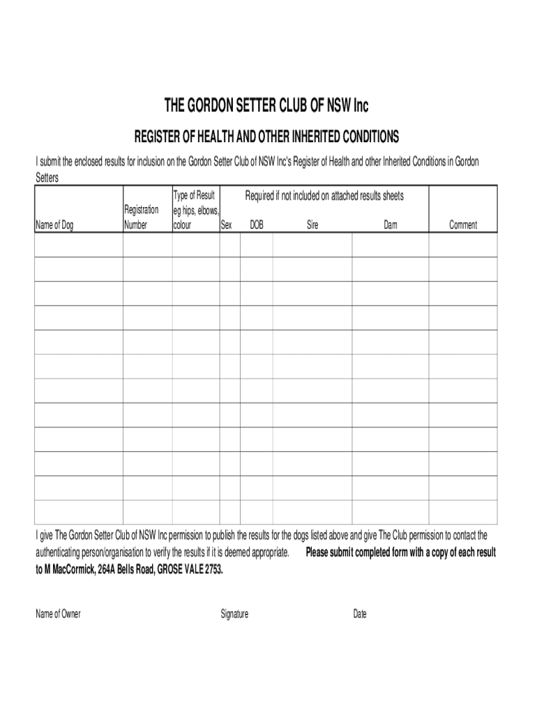 I submit the enclosed results for inclusion on the Gordon Setter Club of NSW Inc\'s Register of Health and other
