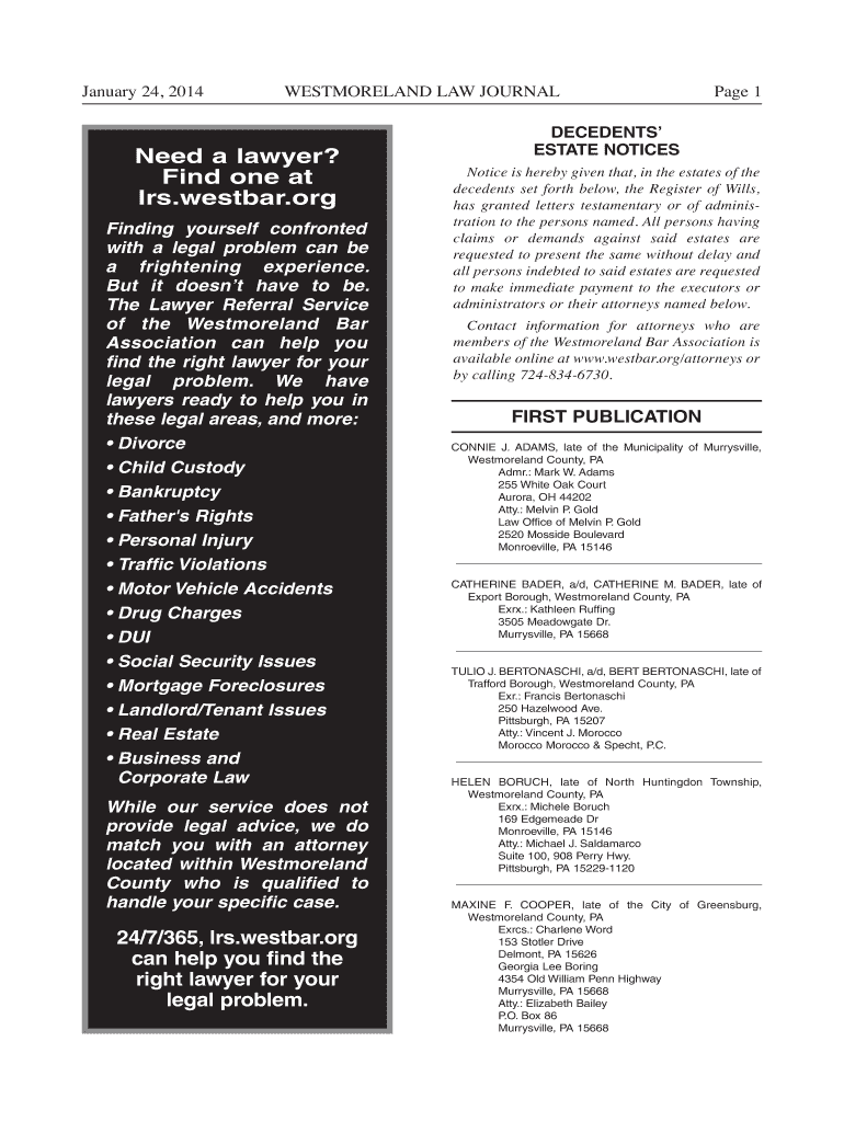 January 24, 2014, WESTMORELAND LAW JOURNAL Need a lawyer? Find one at LRS.west bar.org Finding yourself confronted with a legal problem can be a frightening experience. But it doesn't have to be.