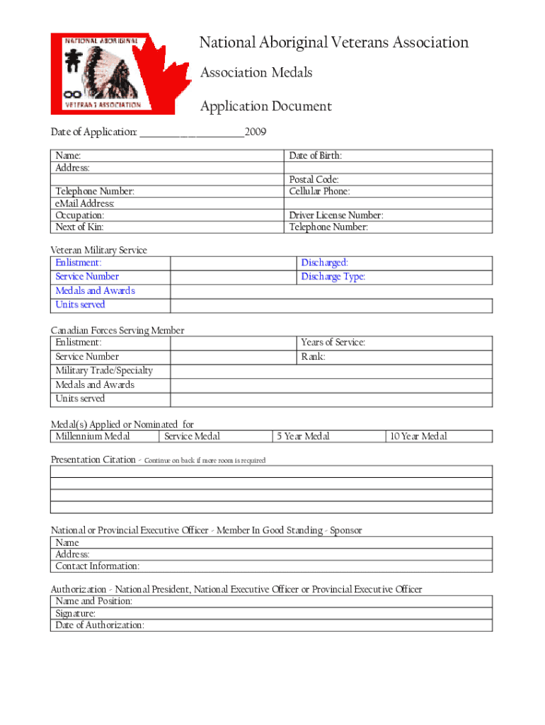 National Aboriginal Veterans Association Medals Application Document Date of Application: 2009 Name: Address: Telephone Number: email Address: Occupation: Next of Kin: Veteran Military Service Enlistment: