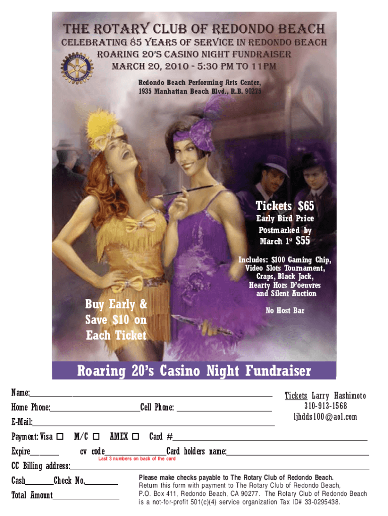 Redondo Beach Performing Arts Center, 1935 Manhattan Beach Blvd., R.B. 90275Tickets $65 Early Bird Price Postmarked by March 1st $55Buy Early & Save $10 on Each TicketIncludes: $100 Gaming Chip, Video