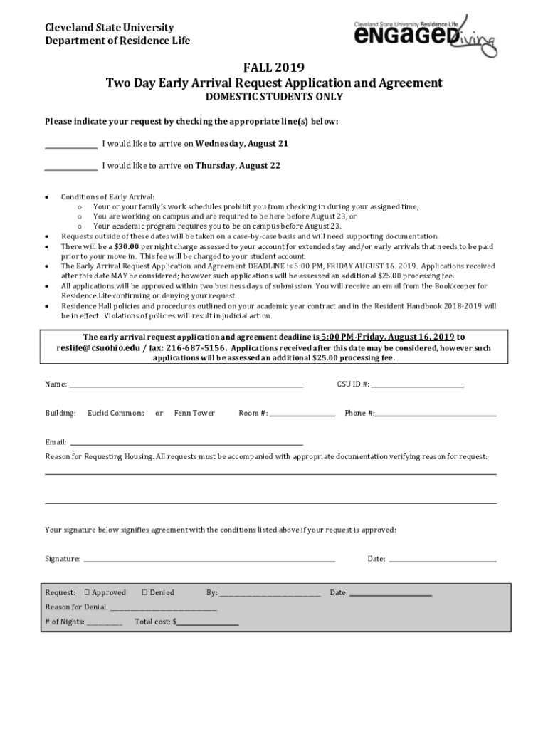 Cleveland State University Department of Residence Nightfall 2019 Two Day Early Arrival Request Application and Agreement DOMESTIC STUDENTS ONLY Please indicate your request by checking the appropriate