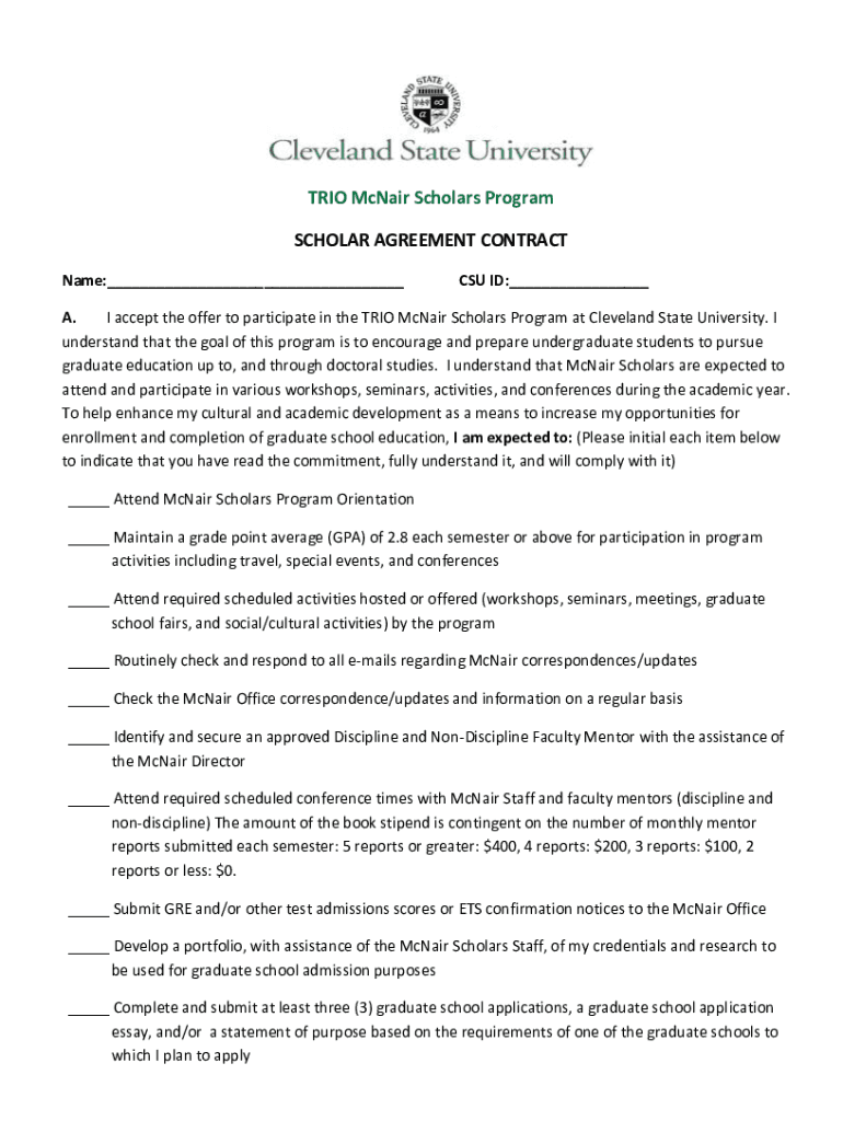 TRIO McNair Scholars Program SCHOLAR AGREEMENT CONTRACT Name: CSU ID: A. I accept the offer to participate in the TRIO McNair Scholars Program at Cleveland State University. I understand that the