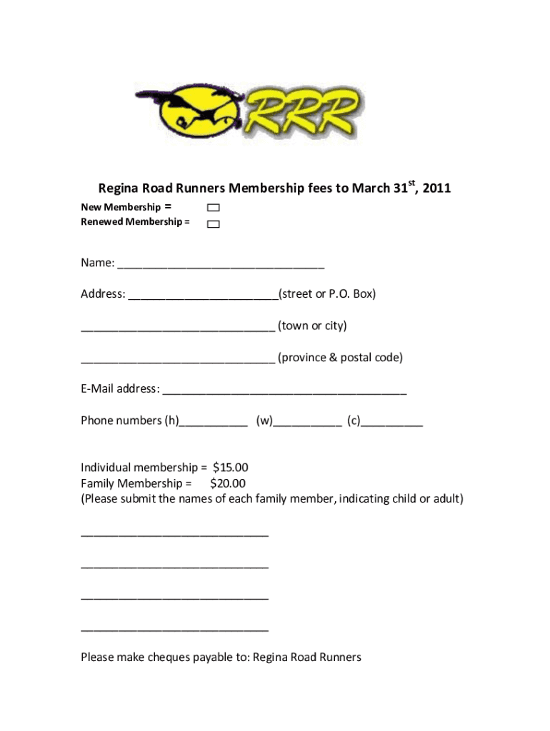 Regina Road Runners Membership fees to March 31st, 2011 New Membership Renewed Membership Name: Address: (street or P.O. Box) (town or city) (province & postal code) Email address: Phone numbers (h)
