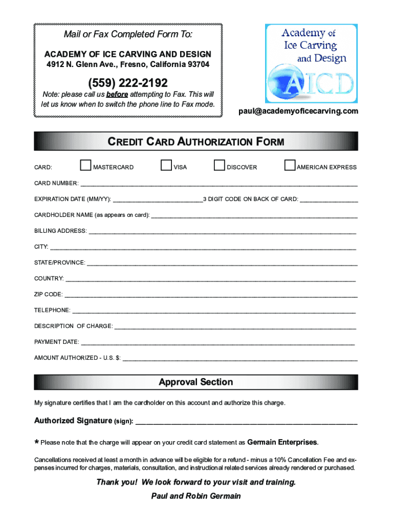 Mail or Fax Completed Form To: ACADEMY OF ICE CARVING AND DESIGN 4912 N. Glenn Ave., Fresno, California 93704(559) 2222192 Note: please call us before attempting to Fax. This will let us know when