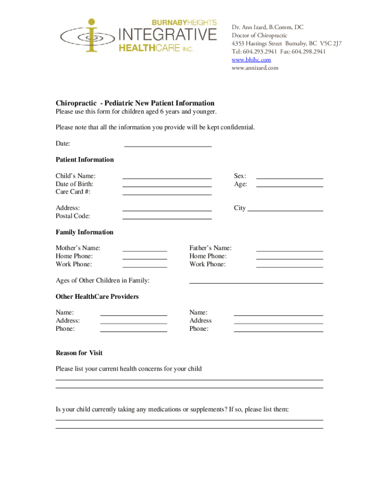 Dr. Ann Lizard, B.Comm, DC Doctor of Chiropractic 4353 Hastings Street Burnaby, BC V5C 2J7 Tel: 604.293.2941 Fax: 604.298.2941 www.bhihc.com www.annizard.comChiropractic Pediatric New Patient Information