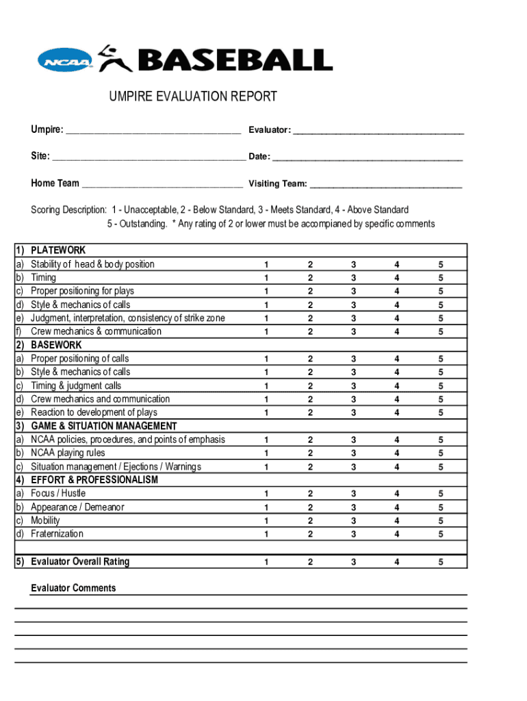 UMPIRE EVALUATION REPORT Umpire: Evaluator: Site: Date: Home Team Visiting Team: Scoring Description: 1 Unacceptable, 2 Below Standard, 3 Meets Standard, 4 Above Standard 5 Outstanding. * Any rating