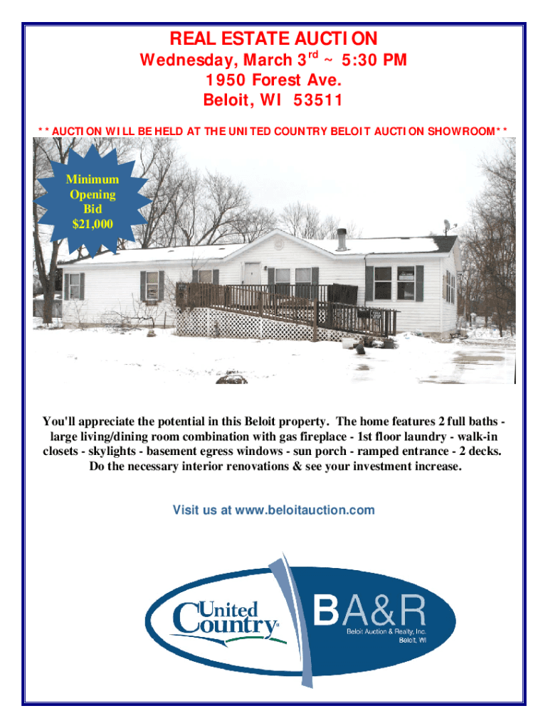 REAL ESTATE AUCTION Wednesday, March 3rd 5:30 PM 1950 Forest Ave. Beloit, WI 53511 **AUCTION WILL BE HELD AT THE UNITED COUNTRY BELOIT AUCTION SHOWROOM** Minimum 25,000 Opening Bid $21,000You'll appreciate