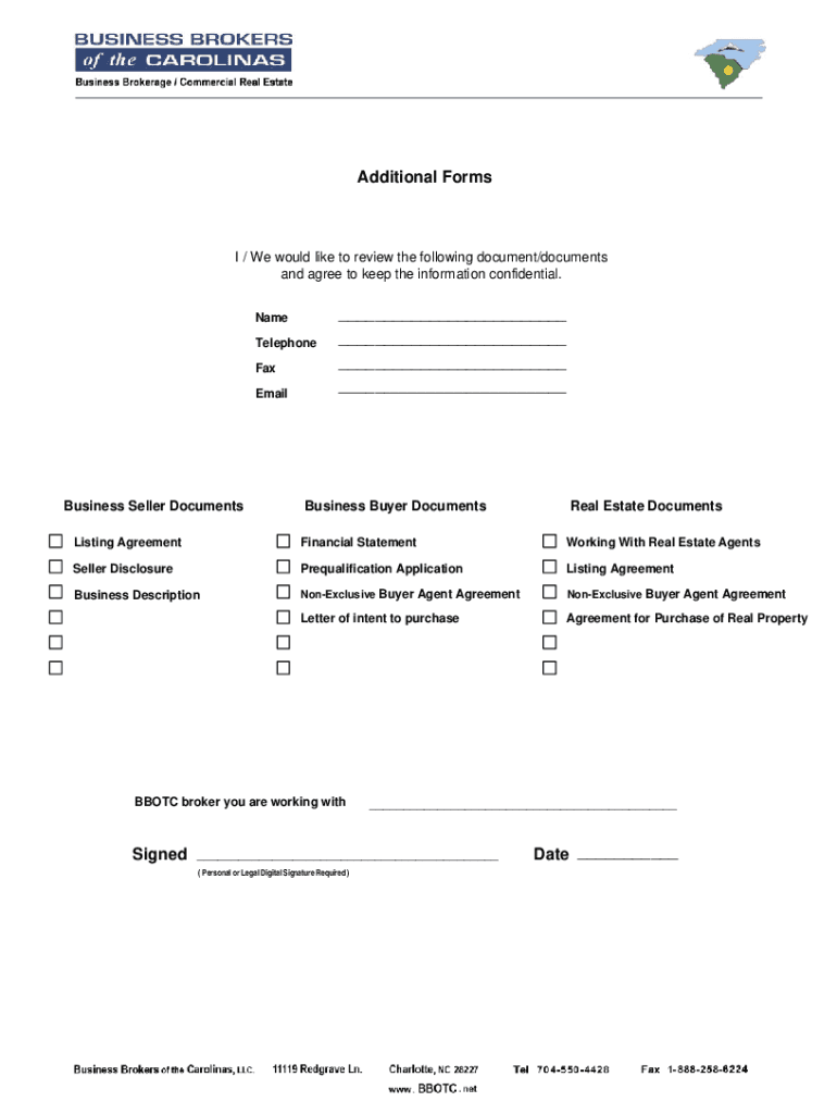 Additional Forms / We would like to review the following document/documents and agree to keep the information confidential. Name Telephone Fax EmailBusiness Seller Documents Business Buyer Documentarian