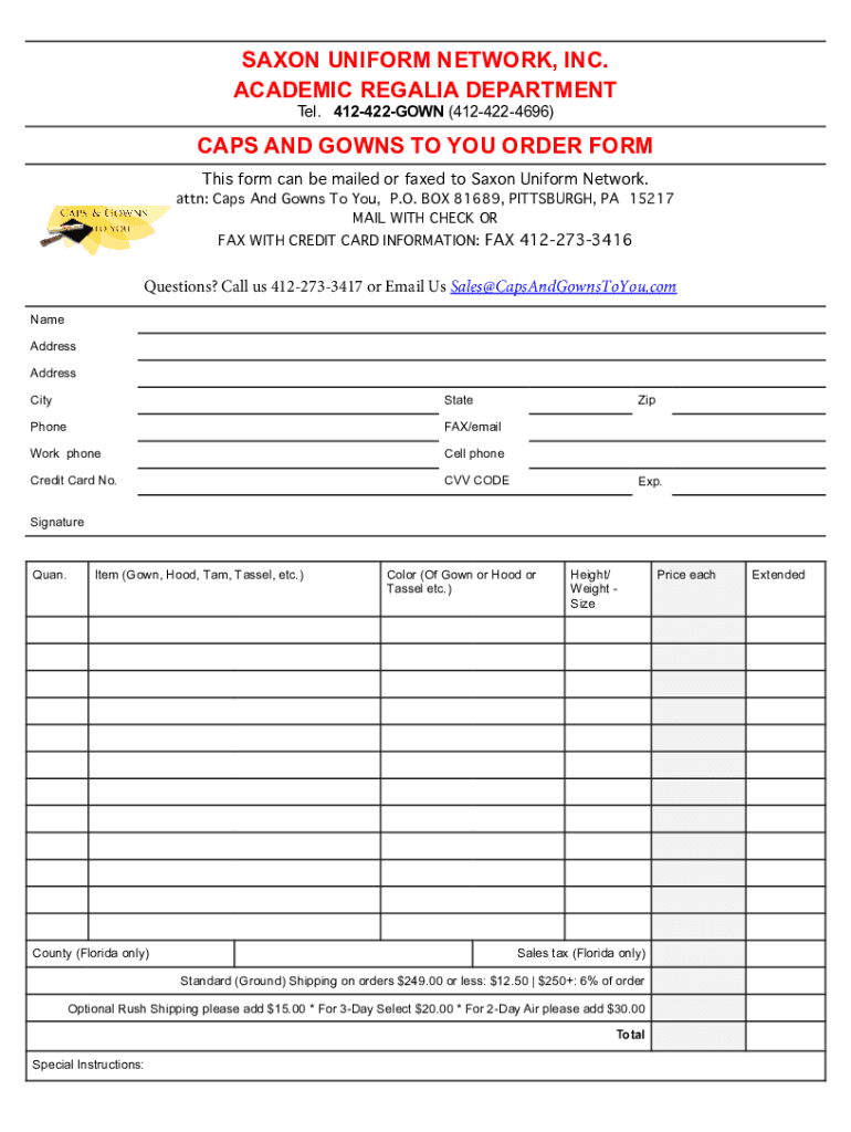 Tel. 412422GOWN (4124224696)CAPS AND GOWNS TO YOU ORDER FORM
