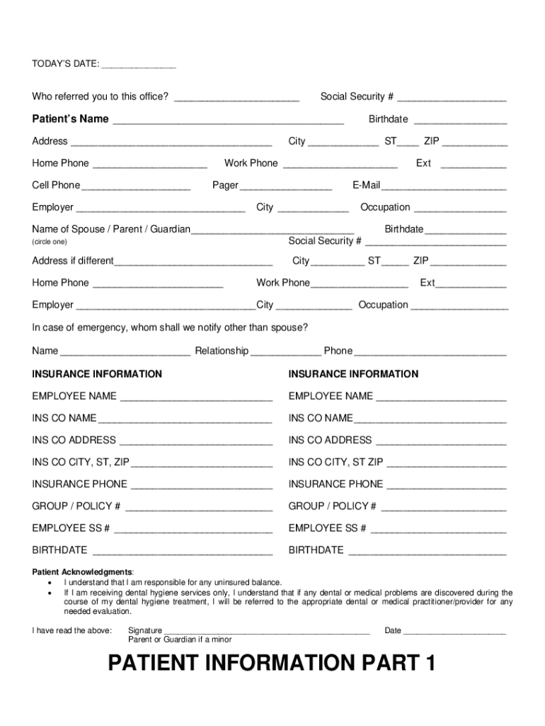 TODAYS DATE: Who referred you to this office? Social Security # Patients Name Address Home Phone Cell Phone Birthdate City ST ZIP Work Phone Pager Employer City Ext Email Occupation Name of Spouse
