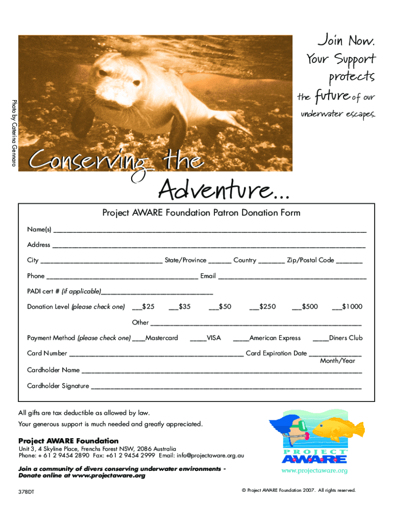 Join Now. Your Support protects Photo by Caterina Gennarothefuture o f our underwater escapes. Conserving the Adventures... Project AWARE Foundation Patron Donation Forename(s) Address City State/Province