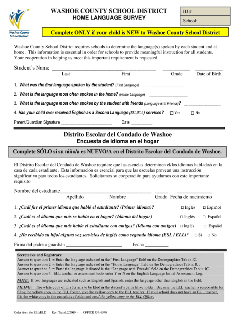 WASHOE COUNTY SCHOOL DISTRICT ID #HOME LANGUAGE SURVEYSchool:Complete ONLY if your child is NEW to Washoe County School District Washoe County School District requires schools to determine the language(s)