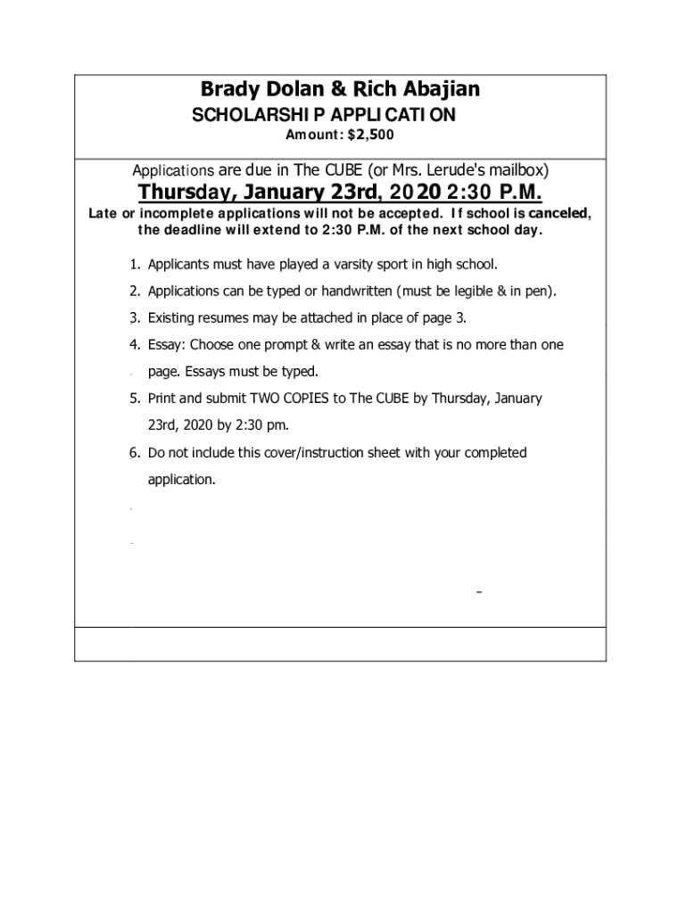 Brady Dylan & Rich AbajianSCHOLARSHIP APPLICATION Amount: $2,500Applications are due in The CUBE (or Mrs. Le rude's mailbox)Thursday, January 23rd, 2020 2:30 P.M. Late or incomplete applications will