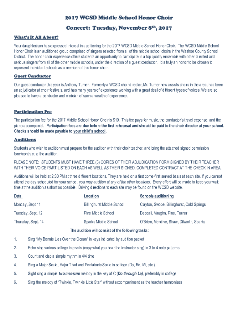Your daughter/son has expressed interest in auditioning for the 2017 CSD Middle School Honor Choir. The