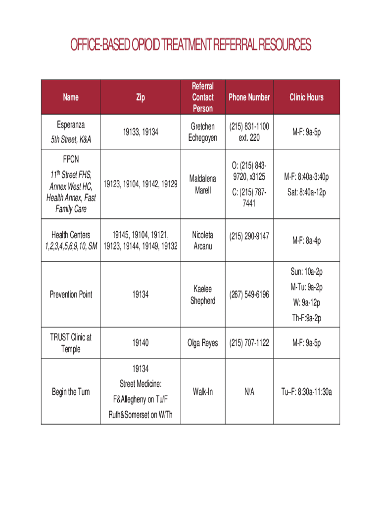 OFFICIATED OPIOID TREATMENT REFERRAL RESOURCES Name Esperanza 5th Street, K&AZipReferral Contact Persephone NumberClinic Hours19133, 19134Gretchen Echelon(215) 8311100 ext. 220MF: 9a5pFPCN 11thStreet