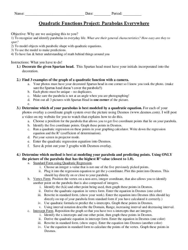 Name: Date: Period: Quadratic Functions Project: Parabolas Everywhere Objective: Why are we assigning this to you? 1) To recognize and identify parabolas in everyday life. What are their general characteristics?