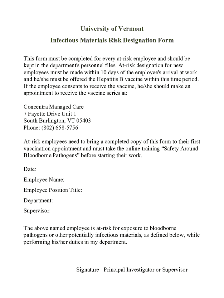 Get the free University of Vermont Infectious Materials Risk Designation Form