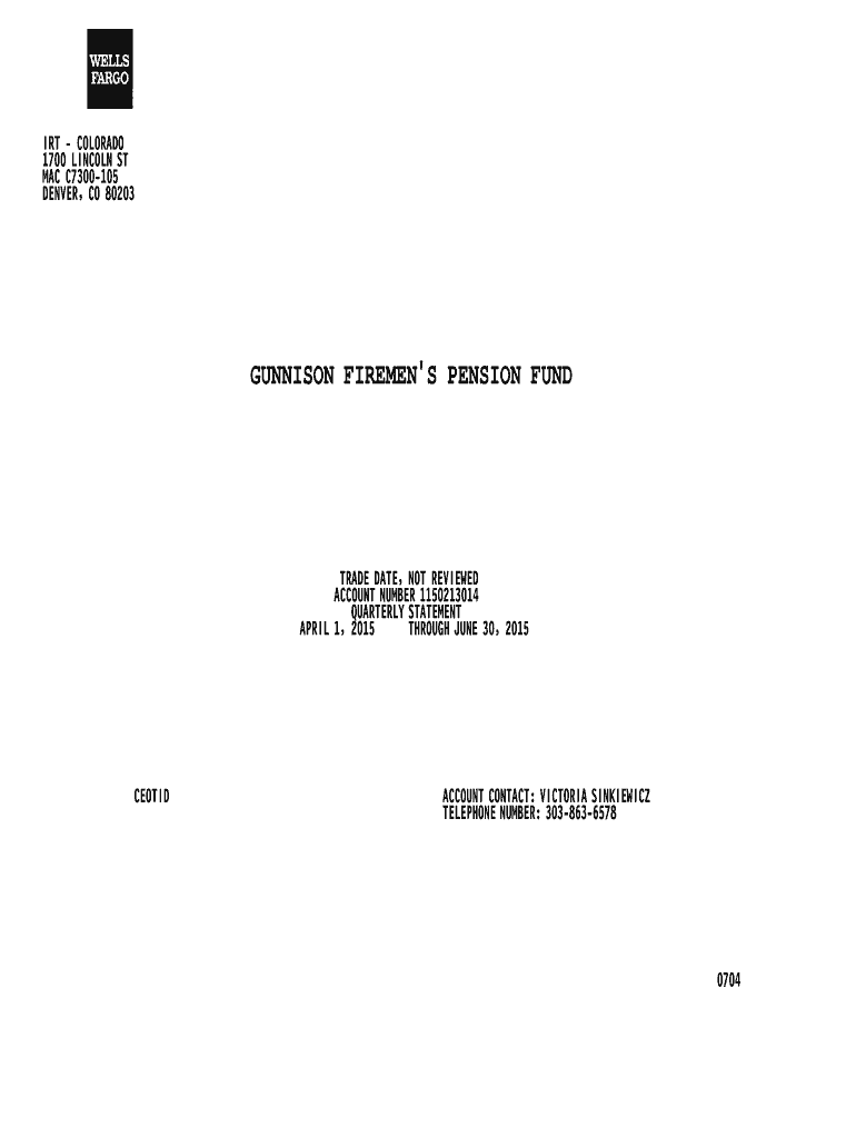 IRT COLORADO 1700 LINCOLN ST MAC C7300105 DENVER, CO 80203 UNISON FIREMEN S PENSION FUND TRADE DATE, NOT REVIEWED ACCOUNT NUMBER 1150213014 QUARTERLY STATEMENT APRIL 1, 2015, THROUGH JUNE 30, 2015,