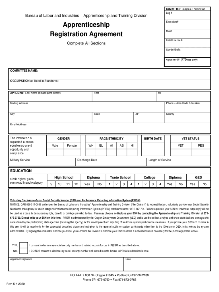 COMMITTEE: Complete This Section Log #Bureau of Labor and Industries Apprenticeship and Training DivisionException #Apprenticeship Registration Agreement MA # Initial License #Complete All SectionsSymbol/Suffix