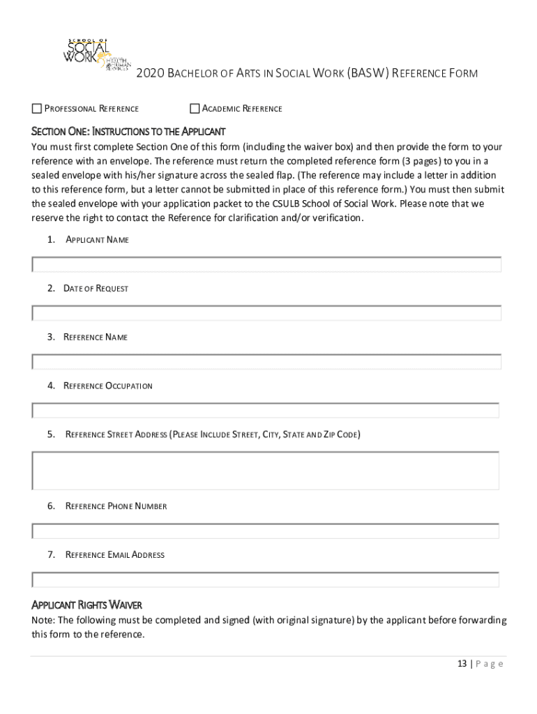 Get the free 2020 Bachelors of Arts in Social Work (BASW) Reference Form - www2 csulb