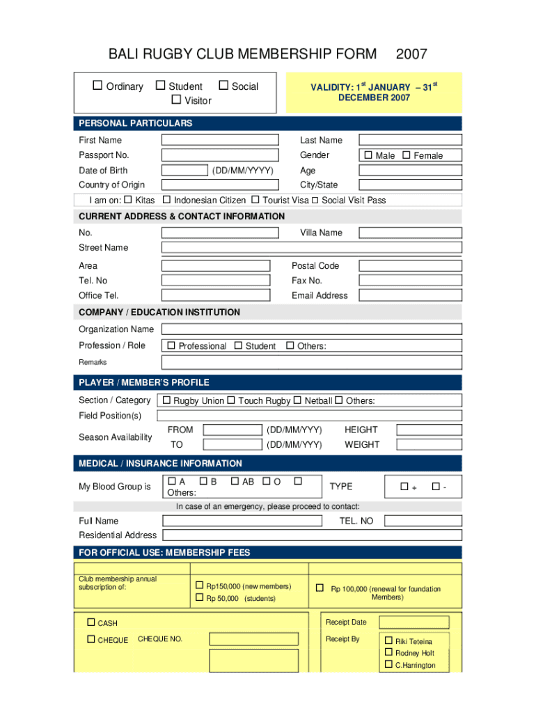 BALI RUGBY CLUB MEMBERSHIP FORM Ordinary Student Social Visitor2007ststVALIDITY: 1 JANUARY 31 DECEMBER 2007PERSONAL PARTICULARS First Nameless NamePassport No. Generate of Birth(DD/MM/YYY)Country