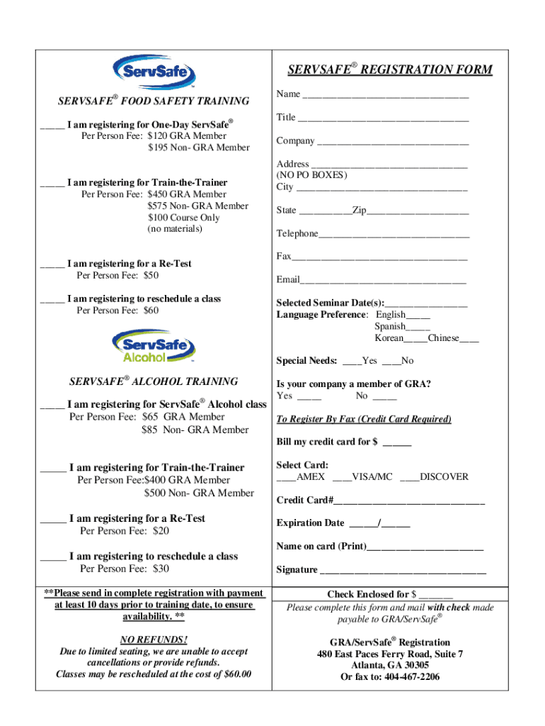 SERVICE REGISTRATION FORM SERVICE FOOD SAFETY TRAINING I am registering for One Day Service Per-Person Fee: $120 GRA Member $195 Non GRA Member I am registering for TraintheTrainer Per-Person Fee: