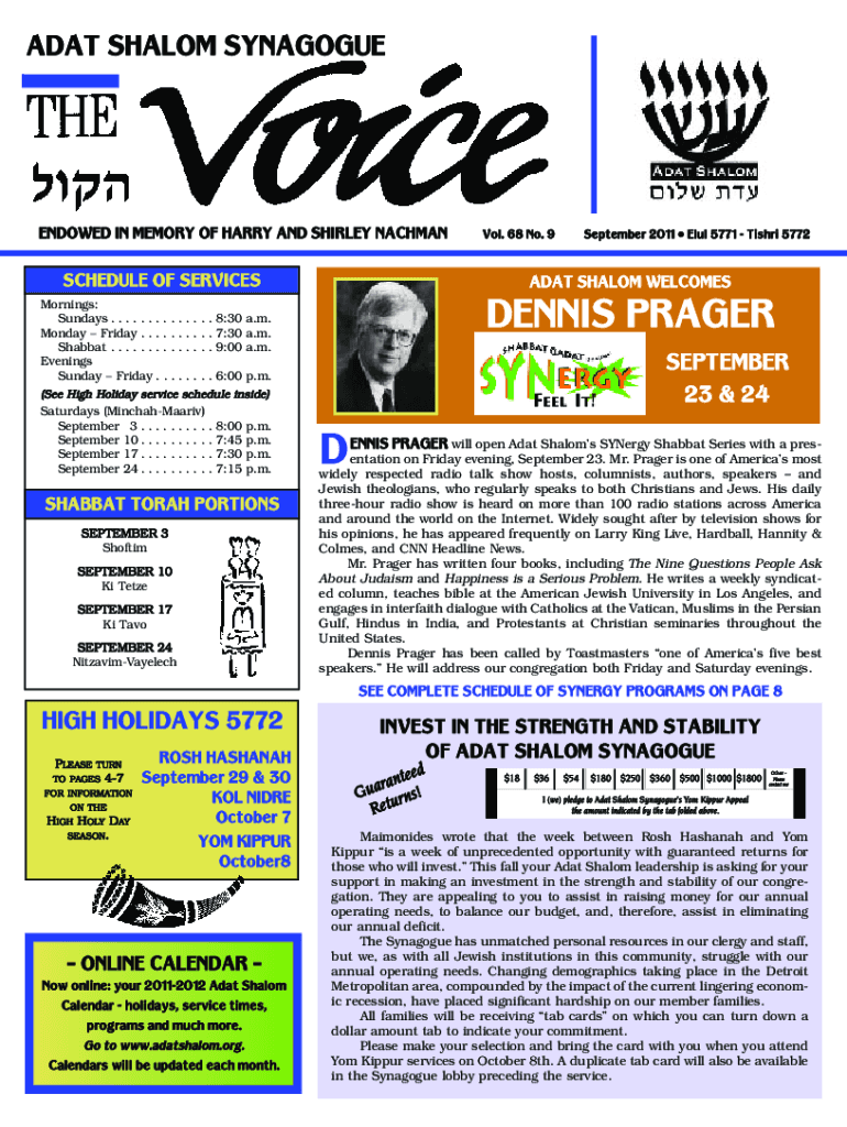 ADAM SHALOM SYNAGOGUEENDOWED IN MEMORY OF HARRY AND SHIRLEY NACHMANSCHEDULE OF SERVICES Mornings: Sundays. . . . . . . Monday Friday. . . Shabbat. . . . . . . Evenings Sunday Friday. SEPTEMBER 3 Showtime