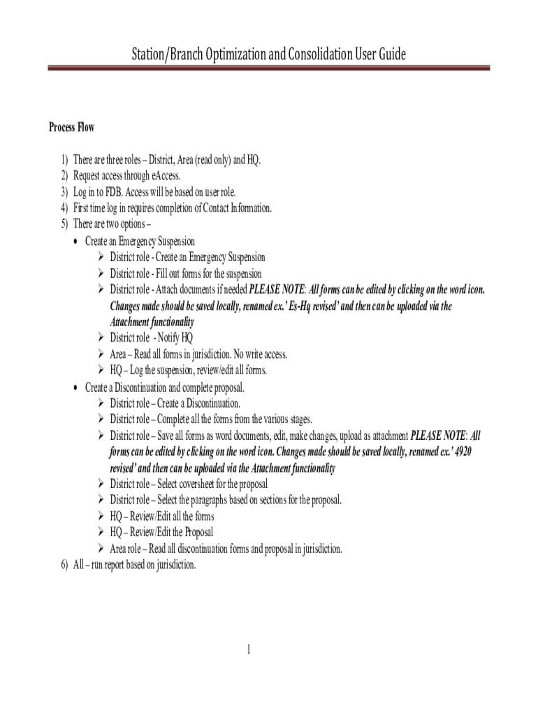 Station/Branch Optimization and Consolidation User GuideProcess Flow 1) 2) 3) 4) 5)There are three roles District, Area (read only) and HQ. Request access through access. Log in to FDB. Access will