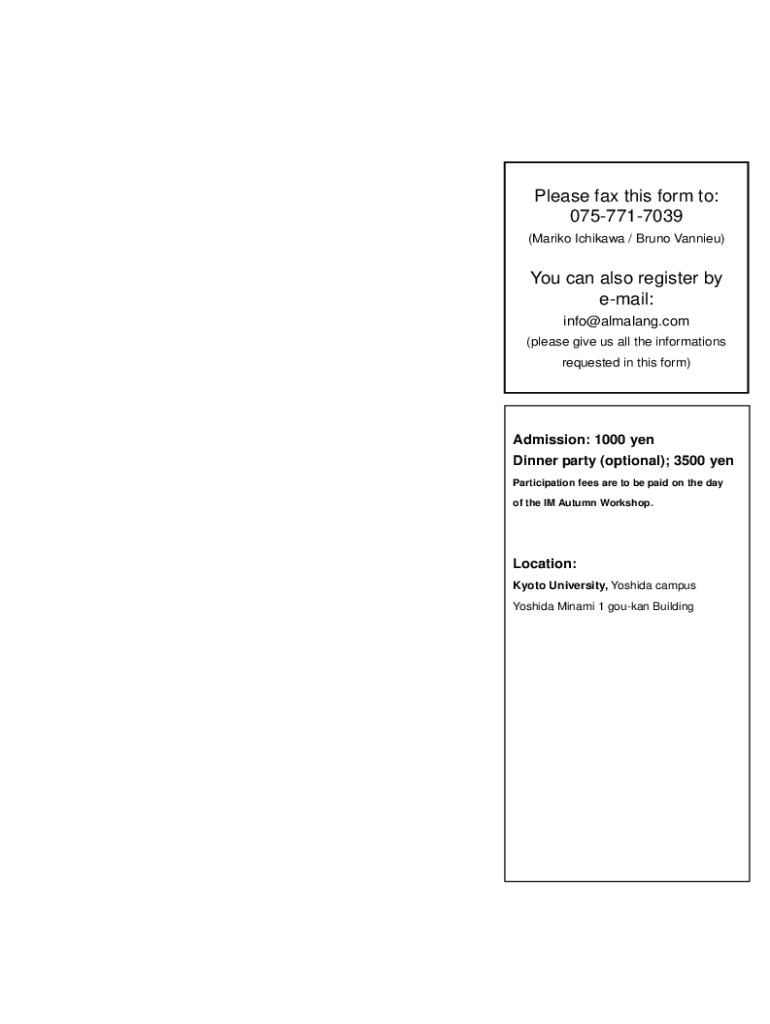 I'm Autumn Workshop 2007 Registration 7th Immediate Method Autumn Workshop for conversation teaching in Japan Kyoto University, November 3rd, 2007Please fax this form to: 0757717039 (Mario Chicana