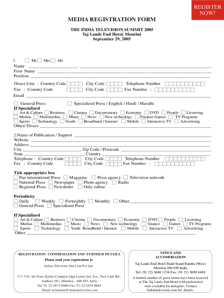 REGISTER NOW!MEDIA REGISTRATION FORM THE INDIA TELEVISION SUMMIT 2005 TAJ Lands End Hotel, Mumbai September 29, 20051. Mr Mrs Ms Name First Name Position Direct Line : Country Code City Code Telephone