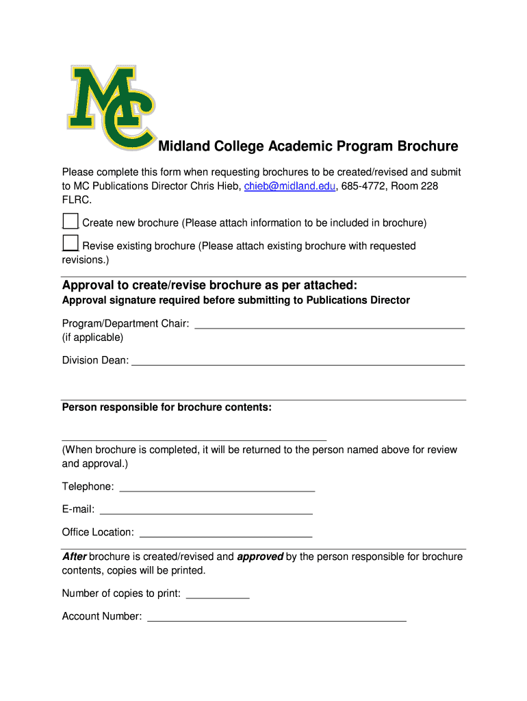 Midland College Academic Program Brochure Please complete this form when requesting brochures to be created/revised and submit to MC Publications Director Chris Hair, chief midland.edu, 685-4772,