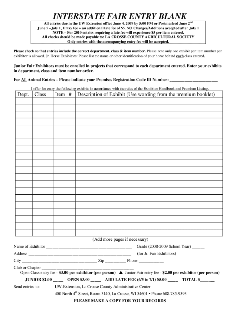 INTERSTATE FAIR ENTRY BLANK All entries due in the UW Extension office June 4, 2009, by 5:00 PM or Postmarked June 2nd June 5 July 1, Entry fee + an additional late fee of $5. NO Changes/Additions