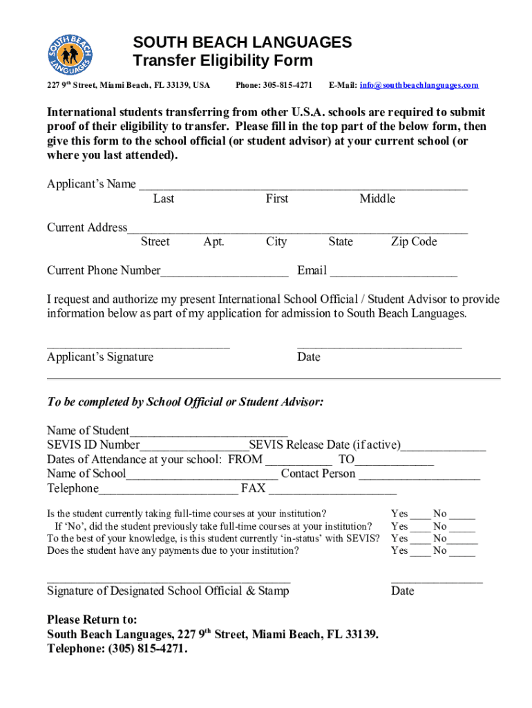 SOUTH BEACH LANGUAGES Transfer Eligibility Form 227 9th Street, Miami Beach, FL 33139, Sousaphone: 3058154271EMail: info southbeachlanguages. International students transferring from other U.S.A.