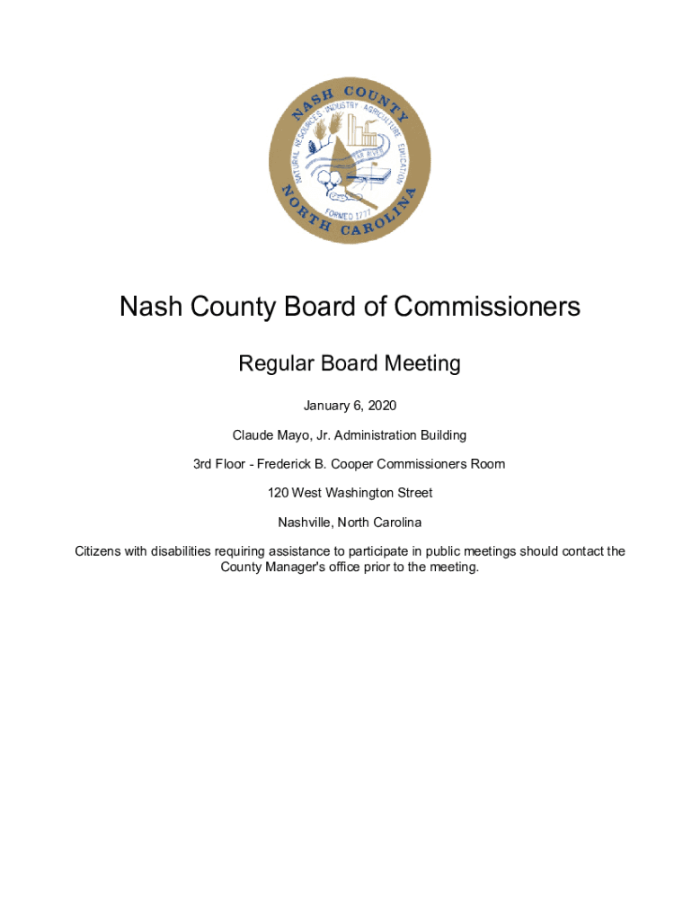 Nash County Board of Commissioners Regular Board Meeting January 6, 2020, Claude Mayo, Jr. Administration Building 3rd Floor Frederick B. Cooper Commissioners Room 120 West Washington Street Nashville,