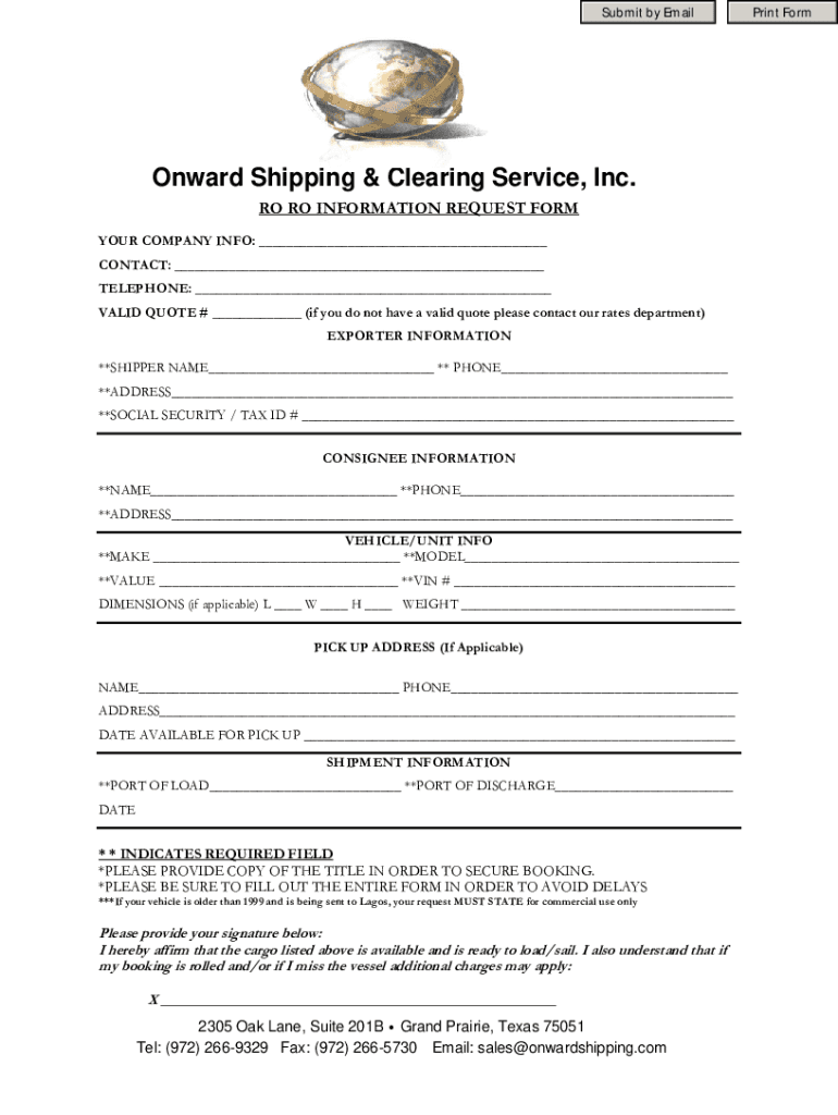 Submit by EmailOnward Shipping HIPPING & A Clearing D C L E A R I Service, N G S E R V I Inc. CES, SAFEWAYINCRO RO INFORMATION REQUEST FORM YOUR COMPANY INFO: CONTACT: TELEPHONE: VALID QUOTE # (if