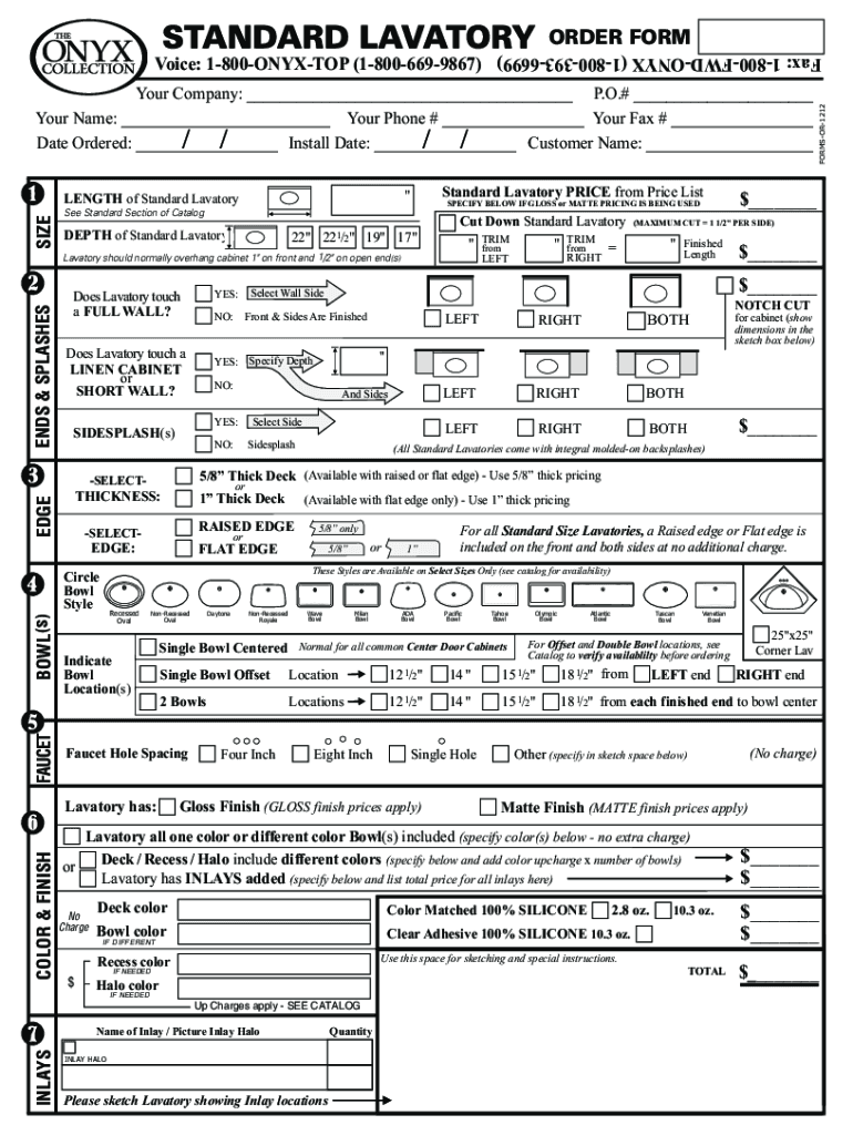 ORDER FORM Your Company: P.O.# Your Name: Your Phone # Your Fax # / / / / Date Ordered: Install Date: Customer Name: Substandard Lavatory PRICE from Price List “LENGTH of Standard LavatorySPECIFY
