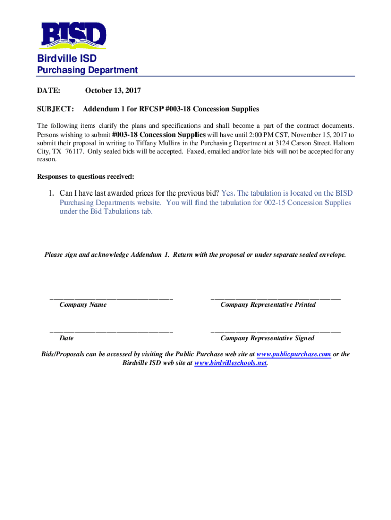 Get the free Addendum 1 for RFCSP #003-18 Concession Supplies