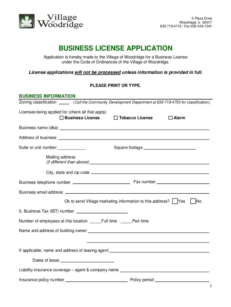 6307194712 / Fax 6304341341BUSINESS LICENSE APPLICATION is hereby made to the Village of Woodridge for a Business License